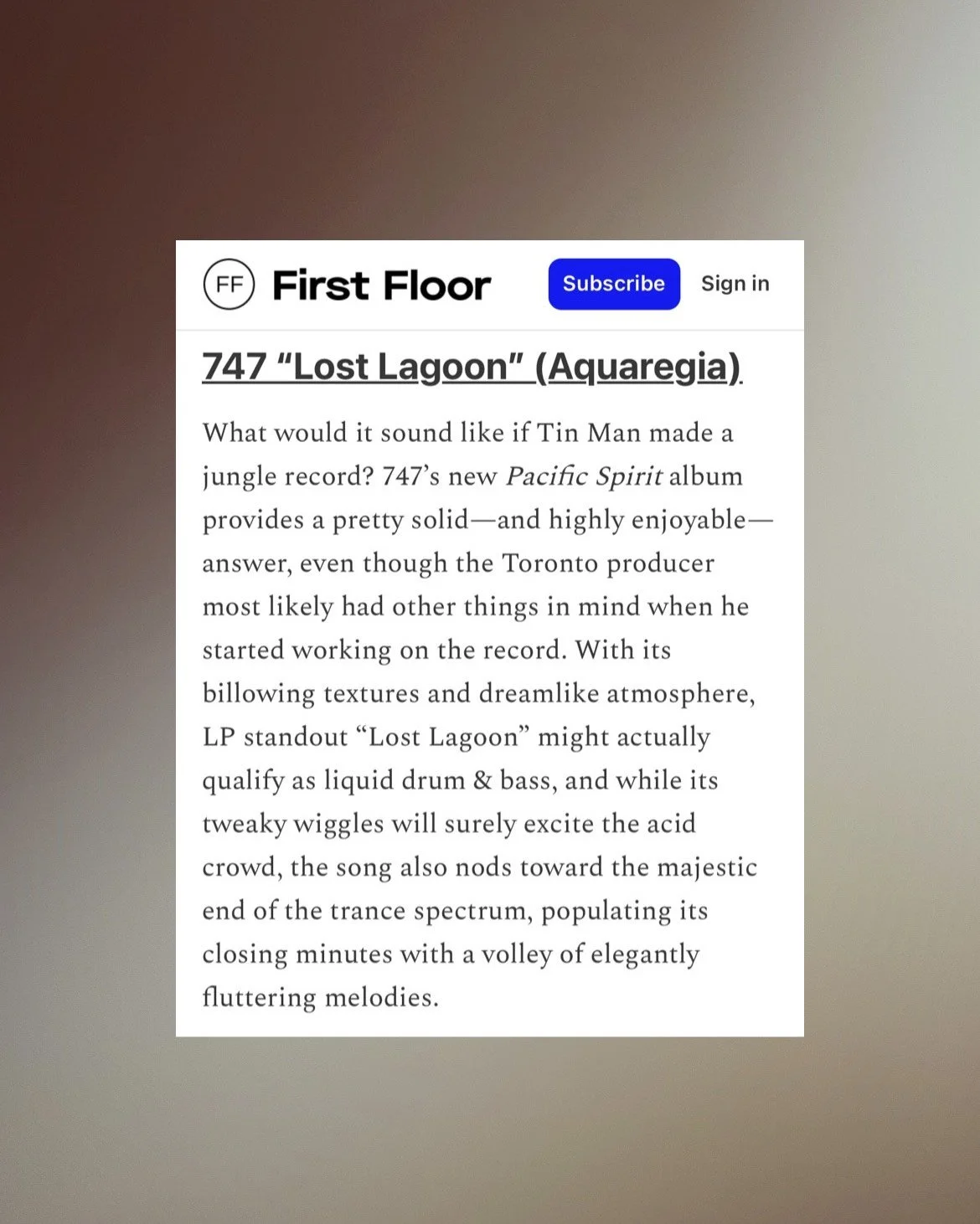 Six years after his last studio album, Canadian producer 747 – aka Ryan Chan – steps out of the shadows with Pacific Spirit , a bold and deeply personal album, released on July 26, 2025 on the Aquaregia label . Far from the linear and melancholic acid techno that made his name with the classic Aurora Centralis in 2017, the musician ventures here in a new direction, full of rhythmic ruptures, liquid nostalgia and nebulous introspection.